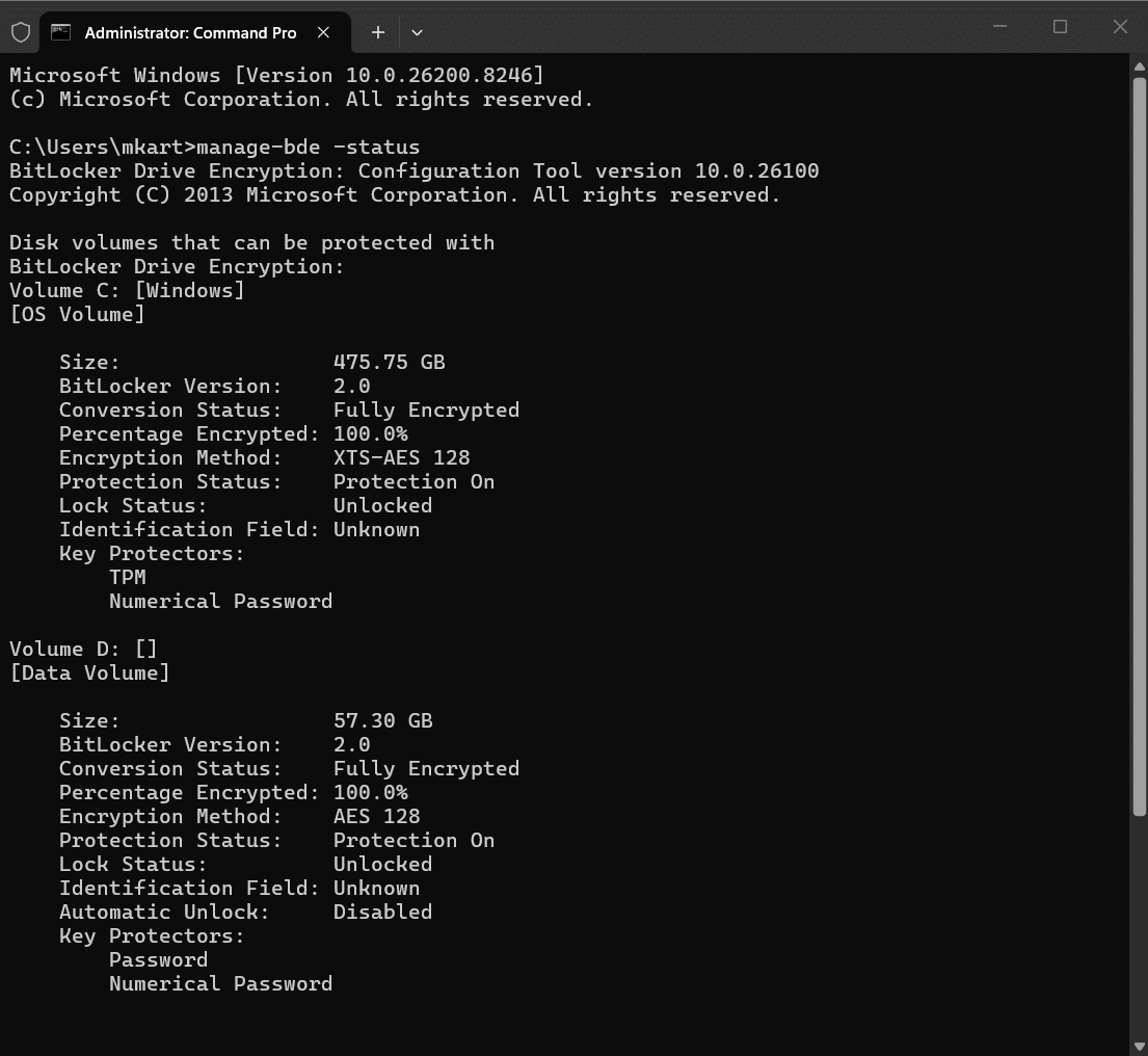 Before disabling BitLocker, run a quick status check to confirm which drives are encrypted and note their mount points and protection status: