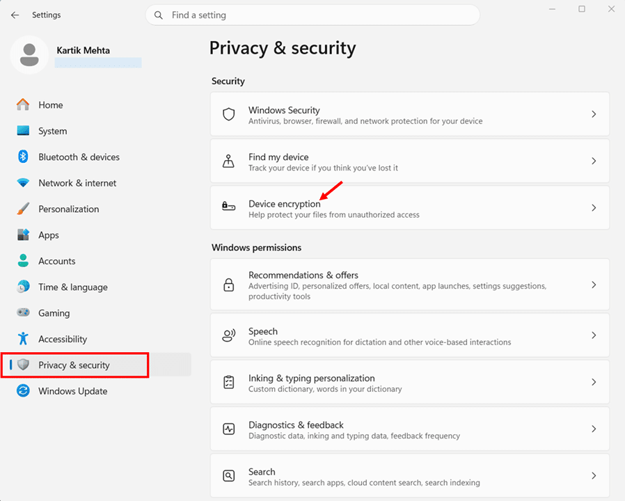 - Click Device encryption under the Security section.