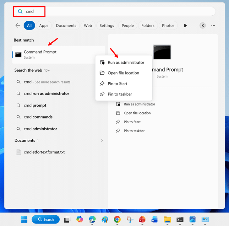 - Press Windows key + S, type cmd, right-click Command Prompt, and select Run as administrator.