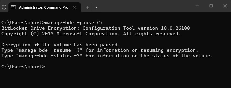If you have already run manage-bde -off and decryption is in progress, you can pause it mid-process without any data loss. This is useful if you need to restart for an unrelated reason or temporarily free up system resources.