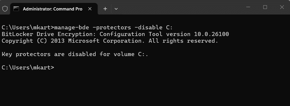 Command Prompt’s manage-bde utility handles every BitLocker off-switch scenario, i.e., decrypting a single drive, suspending protection temporarily, pausing an in-progress decryption, and resuming it again. It is the go-to approach in environments where PowerShell execution policy is restricted, in legacy batch scripts, and for IT admins who prefer the familiar syntax of manage-bde over PowerShell cmdlets.