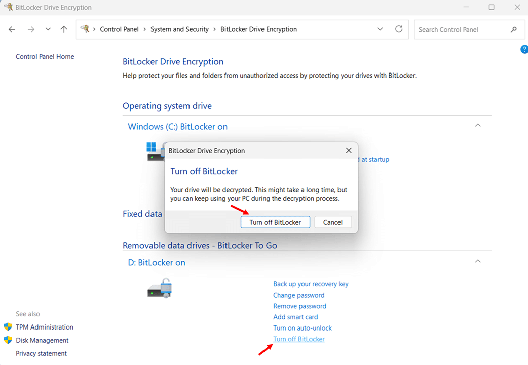 - Click Turn off BitLocker next to the C: drive.