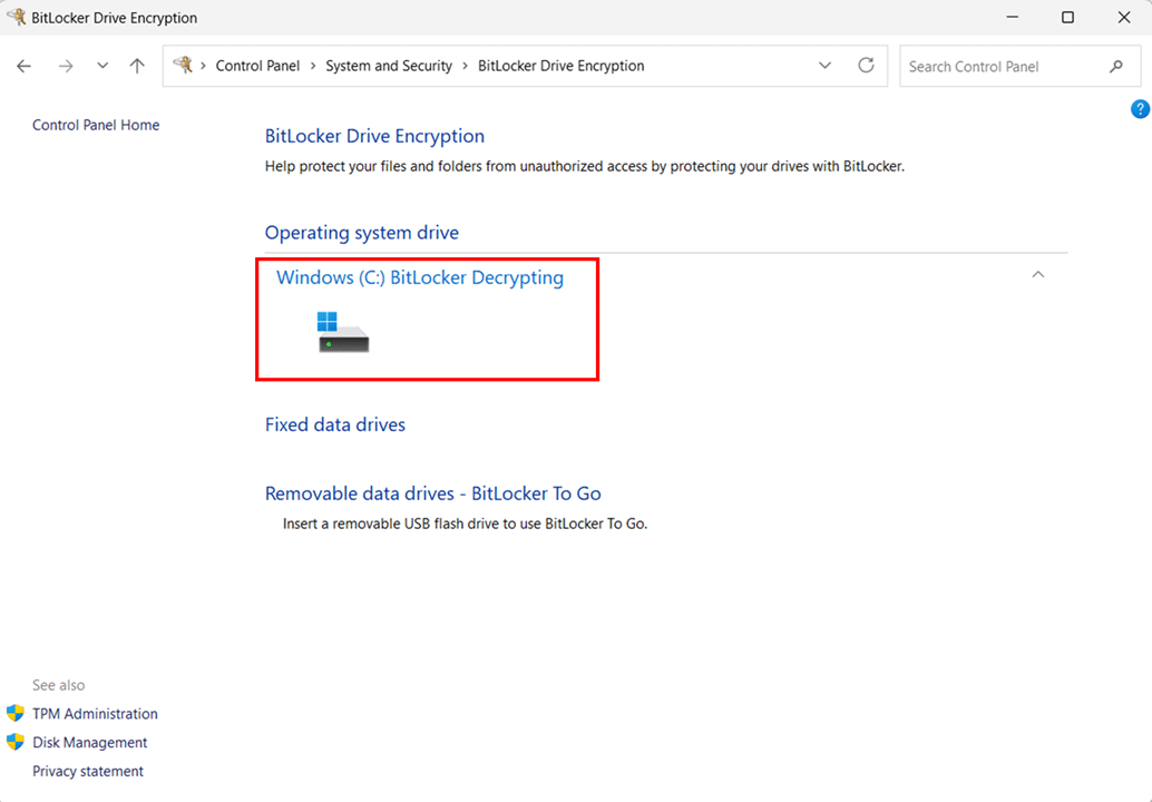 - Decryption runs in the background, you can continue using your PC normally while it completes. The Control Panel page shows “Windows (C:) BitLocker Decrypting” under the drive name during the process