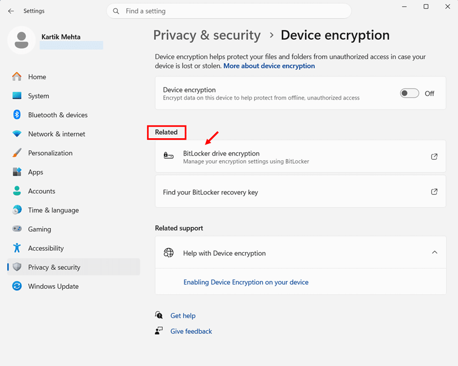 On Windows 11 Pro, Enterprise, and Education editions, the BitLocker drive encryption link under Related on the Device encryption page opens the full BitLocker Drive Encryption management panel in Control Panel.